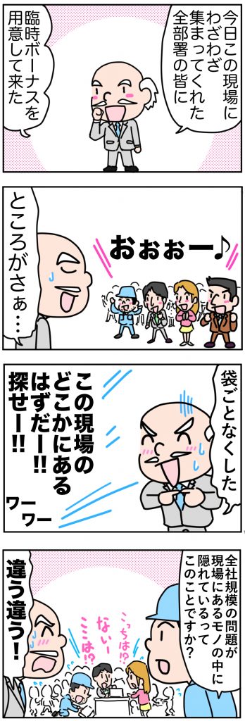 なぜ製造の職場にいろいろな部門の人が入るのでしょうか? これは私が長い間(26年!)のコンサルタント経験から確信していることなのですが、全社規模の問題の多くが現場にあるモノの中に隠れているからなのです。それをみんなで現場・現物で見つけてワイワイガヤガヤと議論して全体最適の答を導き出すのです。